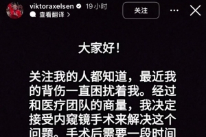 体育资讯3月30日讯 今日,丹麦名将安赛龙在社媒用中英双语发布公告,表示自己将通过内窥镜手术来治疗背伤,并将因此缺席一段时间的比赛。