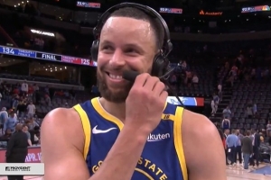 体育资讯4月2日讯 NBA常规赛,勇士客场134-125力克灰熊,库里赛后在场边接受了媒体采访。