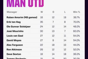 对阵桑德兰的比赛将是阿莫林执教曼联的第50场比赛,但他的5位前任莫耶斯、范加尔、穆里尼奥、索尔斯克亚和滕哈赫,都没能在执教曼联的50场里程碑取得胜利。
