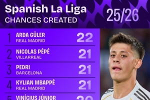 体育资讯10月7日讯 日前,Squawka统计了本赛季西甲创造机会次数排行,居勒尔22次居首。