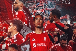 利物浦官方社媒发布了此役的海报,范戴克、埃基蒂克、萨拉赫、索博斯洛伊、加克波、凯尔凯兹出镜。