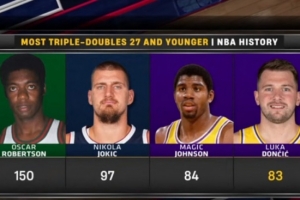据统计,东契奇未超27岁(目前26岁254天)已经83次砍下三双,NBA历史第4,仅次于奥斯卡-罗伯特森(150次)、约基奇(97次)、魔术师(84次)。