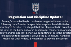 体育资讯11月11日讯 英足总官方消息,伯恩利中场汉尼拔·梅布里因在10月18日对阵利兹联的英超比赛中不当行为而被指控。