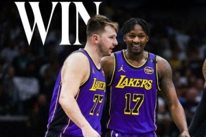 赛后湖人官方晒出赢球海报,击败旧主的东契奇和芬尼-史密斯登上封面。