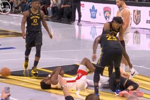 阿门突破撞倒库里,二人双双痛苦倒地。裁判吹罚阿门进攻犯规。