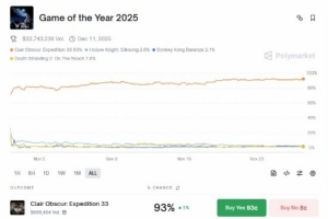 体育资讯11月27日讯 知名博彩网站Polymarket公布了各游戏获得TGA年度最佳的可能性。其中《光与影:33号远征队》以93%几率断崖式领先所有其他游戏。