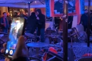 现场画面显示,这些球迷在加约集市广场投掷咖啡馆座椅、互相斗殴,导致周边商铺窗户被砸碎,玻璃遍地,附近酒吧被迫紧急停业。
