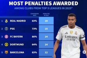 2025年五大联赛俱乐部获得点球榜:皇马19次、巴黎15次、巴萨12次