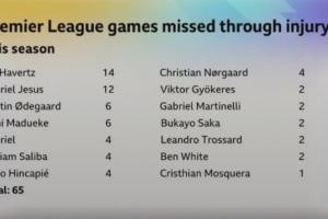 BBC统计阿森纳本赛季截止目前的伤病,因伤导致的球员缺战英超总场次数已达到65场。