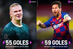据统计,25岁的哈兰德在欧冠已打进55球,26岁前欧冠进球数仅次于梅西(59球),而哈兰德明年7月21日才满26岁。