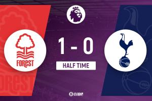 上半场比赛结束,诺丁汉森林1-0热刺。