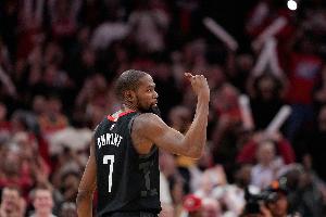 本场,杜兰特投篮18中11,三分8中6,罚球14中11,砍下39分4篮板7助攻2抢断1盖帽,正负值+14。