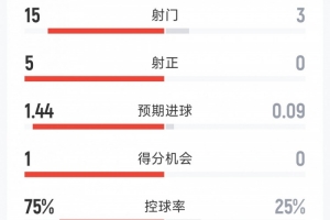 利物浦1-0伯恩利半场数据:射门15-3,射正5-0,红军控球率75%