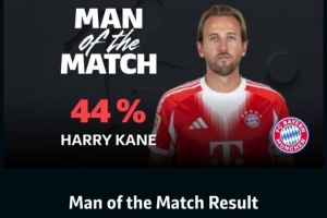 凯恩在本场比赛打进1球,获得了44%的得票率。值得一提的是,替补独造4球的奥利塞并未进入候选名单。