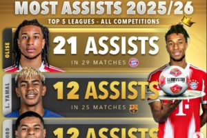 本赛季五大联赛球员助攻榜:奥利塞21助高居榜首,亚马尔次席