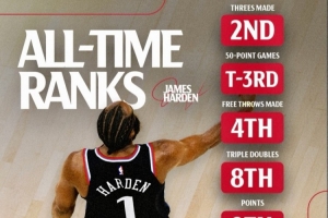 哈登多项数据历史前25:三分命中数第二 罚球命中第四 总得分第九
