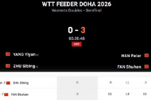 体育资讯1月30日讯 2026WTT支线赛多哈站女双半决赛,韩菲儿/范姝涵3-0击败杨屹韵/朱思冰,晋级决赛。