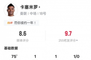 体育资讯2月1日讯 英超第24轮,曼联主场迎战富勒姆,卡塞米罗首发出战,传射建功,还有1次关键传球,另外他在防守端还有3次解围和3次抢断,评分8.6。