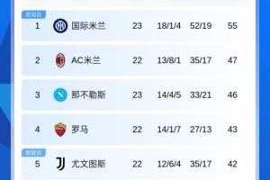 意甲积分榜:国米先赛取胜领先第2米兰8分!尤文稍后出战
