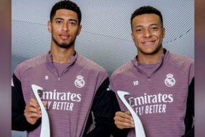 体育资讯2月5日讯 贝林厄姆今天更新Instagram,晒出自己与姆巴佩和FIFPRO最佳阵容奖杯的合影。
