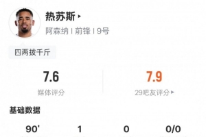 热苏斯本场数据:1进球1过人成功+16次丢失球权,评分7.6