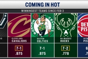 据统计,2月3日至今联盟战绩最好的5支球队为: