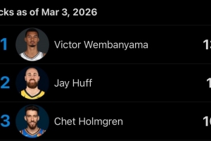 本赛季盖帽前三:文班47场138次 赫夫61场117次 切特55场109次
