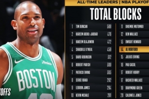 目前,凯尔特人中锋霍福德已经送出了1记盖帽,他的季后赛生涯盖帽数超越朱利叶斯-欧文(239记),上升至NBA历史第14位,排在他前面的是德怀特-霍华德(248记)。