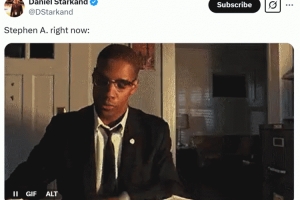 赛后,湖人队记Daniel Starkand发布动图模仿A-史密斯:看到绝杀后怒锤桌子,摘眼镜。